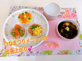 3月3日に園でひなまつり会がありました。給食室もひなまつりメニューを作ってお祝いしました。